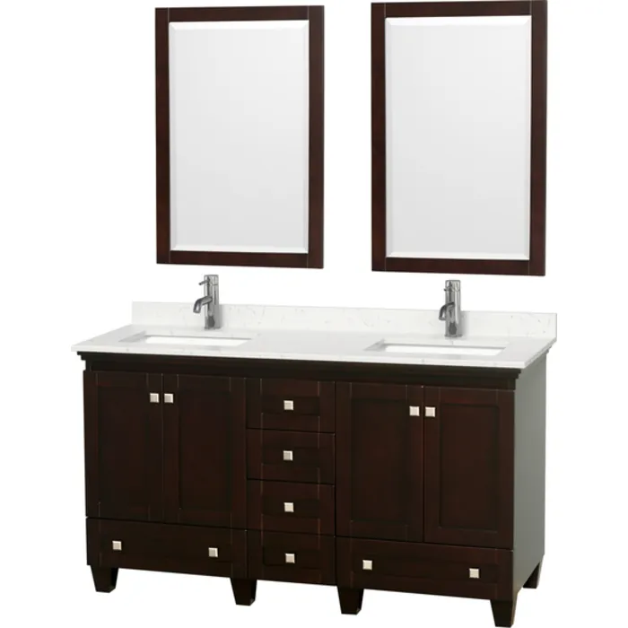 Acclaim 60 Inch Double Bathroom Vanity in Espresso, Light-Vein Carrara Cultured Marble Countertop, Undermount Square Sinks, 24 Inch Mirrors